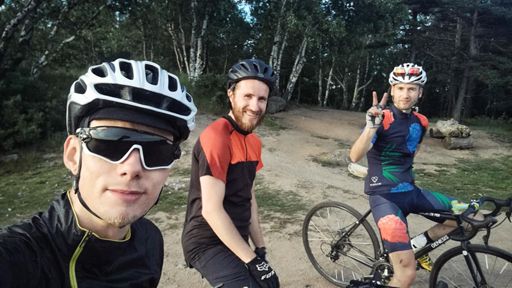 sykler rundt og hilser på hunder i solnedgangen