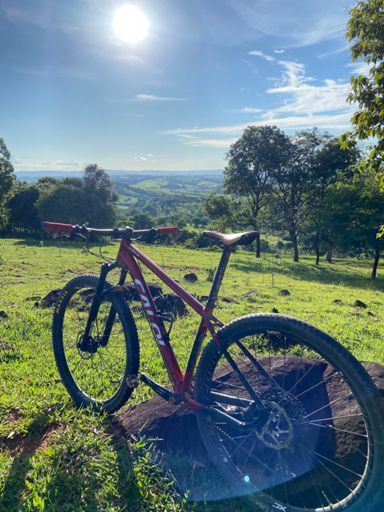 Pedalada de mountain bike ao entardecer