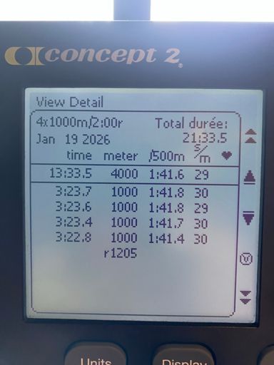 Échauffement 20’ + 4 x 1000m @28-30 + 2 x 2’ r2’ 4 x1’/r1’ @allure test + RAC