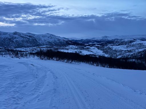 Rolig morgenøkt i -8 grader, sur vind fra nordvest og piskende snøvær. Visstnok -15 grader i opplevd temperatur i følge YR.