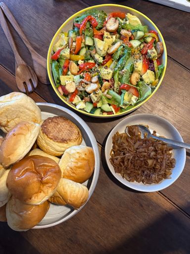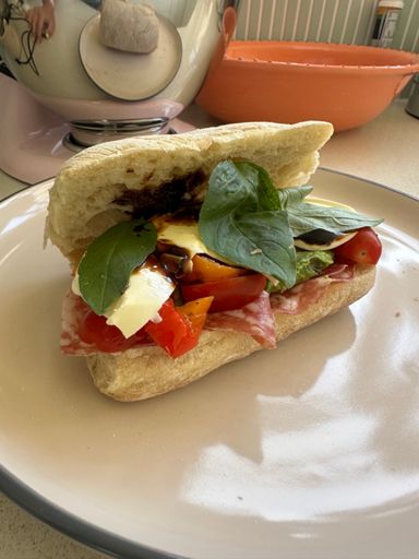 Ciabatta, avo, morzarella, salami, tomatoes, peppers, balsamic glaze and basil.