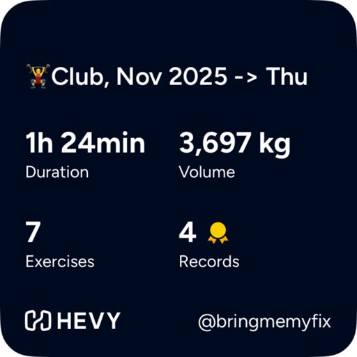 🏋️♂️Club, Nov 2025 -> Tue: struggling a little; probably fatigue and a mindset shift now I know an enforced deload is coming after root canal surgery 😕