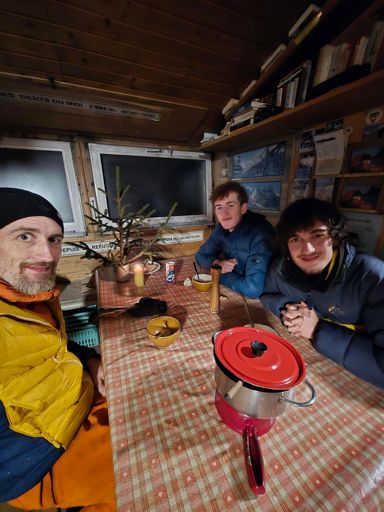 Big boys prefer remote mountain hut to Christmas tree. Dady tends to agree...