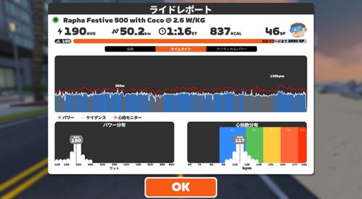 View RideZwift - Group Ride: Rapha Festive 500 with Coco @ 2.6 W/KG on Triple Flat Loops in Watopia