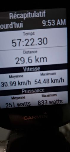 Pré Course Cadence 94 rpm Échauffement 20min 3x1min a 120% 350watts 1min récup Sprints 3 x 30 secondes 1min récup Retour au calme 10min