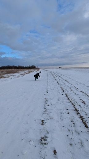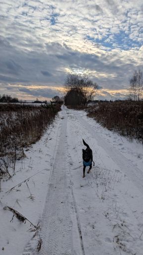 Śnieg, czarny pies i sarenki