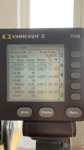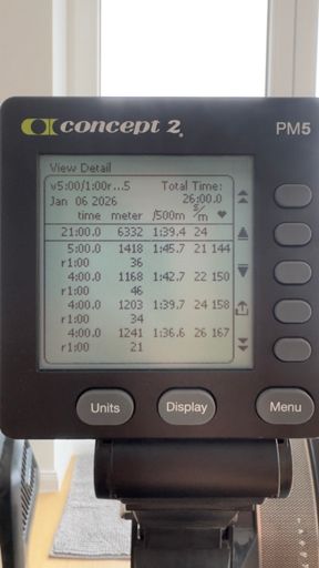 12x5’ (1’/4’; 1:37 22spm; 1:46 20-22spm) no rest in between