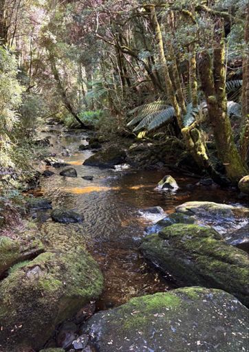Today’s waterfall walk is Nelson Falls reached through a temperate rainforest. 😎 Also a photo from the Geographical Centre of Tasmania, a wallaby from last night bounding past our cottage, and a grainy photo of a couple of Kookaburras early this morning!