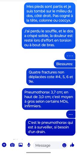 Kendo = 4 fractures côtes #4, 5, 6 et 9 + pneumothorax 3,7 cm.