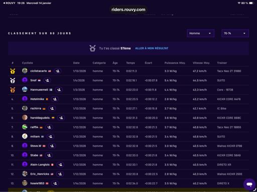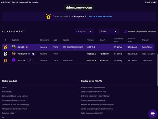 View VirtualRideROUVY - Group Ride: Group Ride with Conor Dunne from GCN 122 eme sur 660 au depart toutes catégories et 3 eme sur 22 en 70 74 ans