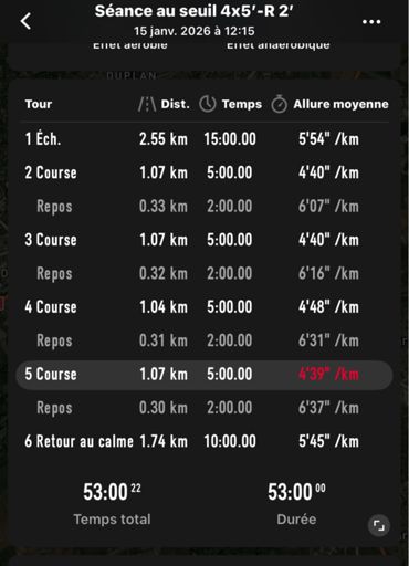 Séance Seuil: 15’ Ech+ 4x5’ Seuil R2’ + Rc 10’