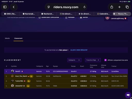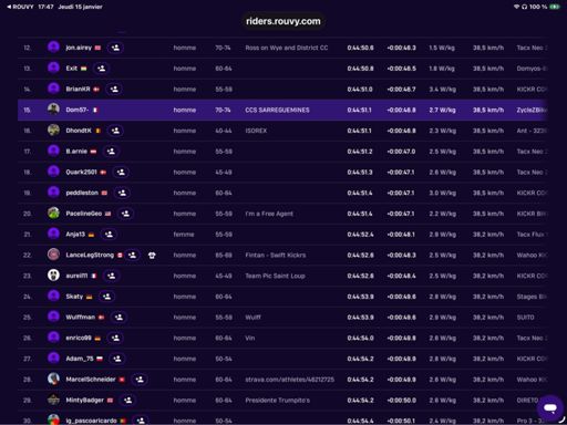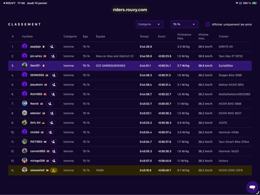 ROUVY - Group Ride: Rouvy Thursday 1.5 to 2.5 w/kg. 15 eme sur 120 en toutes catégories. Et 3ème sur 14 en 70 74 ans