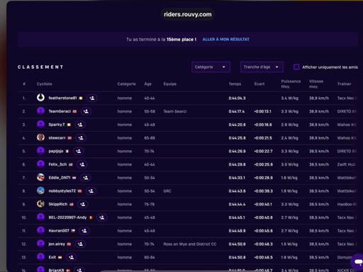 View VirtualRideROUVY - Race: Clara7780. Course. 11 eme sur 26 en toutes catégories. Et premier sur 4 en 70 74 ans