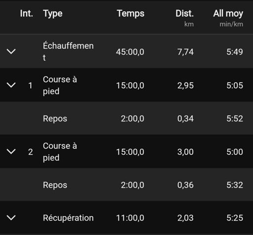 45' EF 2*15' allure proche marathon R2' RAC 11'