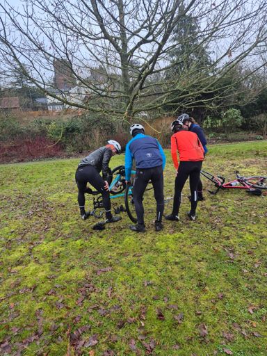 El blue egg ,with lessons in how many cyclists does it take to change a tyre