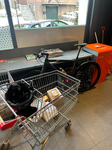 Boodschappen met de MTB, omdat auto gegijzeld wordt door de sneeuw.