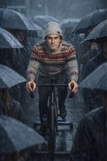 A he-man in a sudden shower shelters from the rain