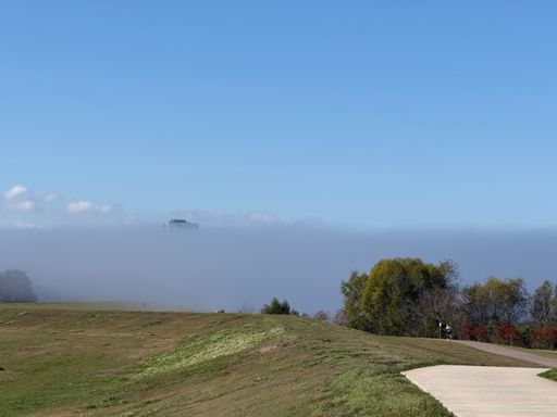 Follow the foggy path road.