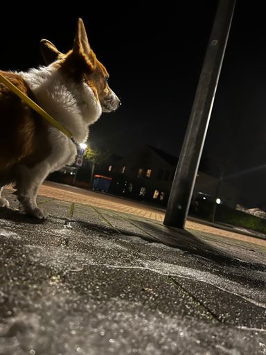 Corgi night walk. Trees, bushes, lampposts: all checked, all clear🦊