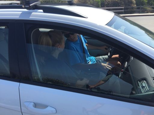 A white Volkswagen station wagon without plates buzzed the Food Park group on Laguna Canyon while flipping the bird
