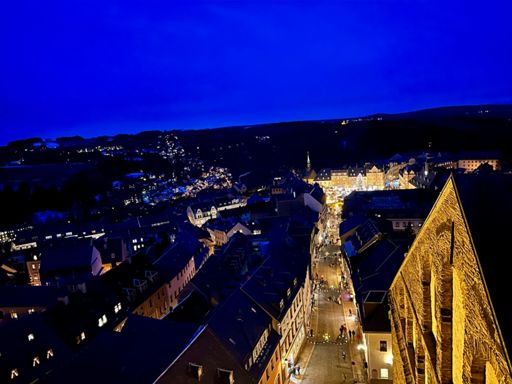 Zwei Kerzen und drei helle Leuchten.