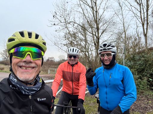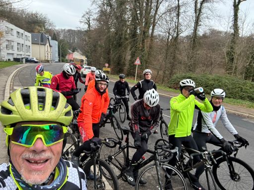 Une quinzaine de courageux (ou inconscients) dans le peloton, un tour parfaitement orchestré par Guy le GPS — qui, miracle du jour, n’a pas recalculé l’itinéraire toutes les 3 minutes. Photo en haut de la côte histoire de récupérer… euh, d’attendre les re