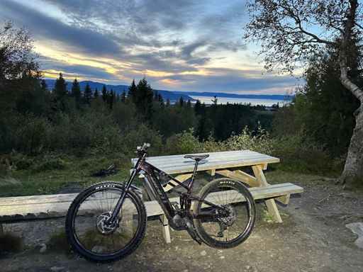 View EMountainBikeRideFinvær i Trondheim og testing av nysykkel med Ståle